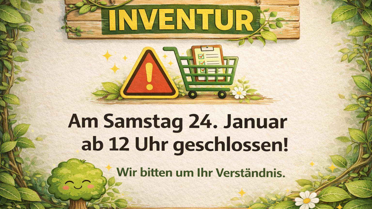 In vierzehn Tagen am Samstag haben wir Inventur und schließen deshalb bereits um 12 Uhr. Bitte beim Einkauf die geänderte Öffnungszeit beachten.